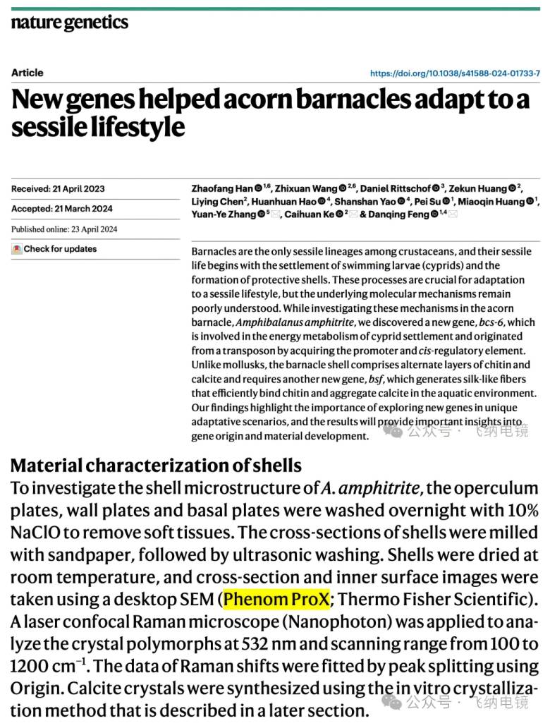 厦门大学海洋与地球学院、海水养殖生物育种全国重点实验室柯才焕教授、冯丹青教授团队,与环境与生态学院张原野副教授团队合作,在海洋生物基因组学和污损生物附着研究领域取得了重要突破。其最新研究成果《New genes helped acorn barnacles adapt to a sessile lifestyle》发表在 Nature Genetics 上,给出了答案:藤壶拥有两个在进化中“新出现”的基因,它们让藤壶能量更足、壳更强、粘得更牢!更重要的是——论文中揭示藤壶壳层结构、蛋白质分布的关键微观图像,由飞纳 Phenom ProX 电镜能谱一体机拍摄完成。