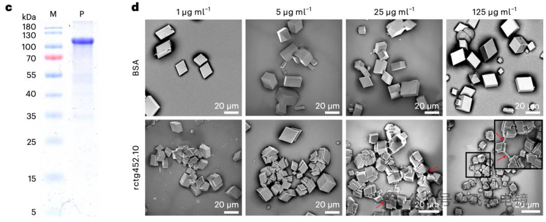 d. 在体外对 ctg452.10 蛋白的功能验证。扫描电镜图像显示了在不同浓度的牛血清白蛋白(BSA)和重组 ctg452.10 蛋白(rctg452.10)条件下碳酸钙晶体的沉淀情况。红色箭头表示 ctg452.10 蛋白形成丝状纤维。