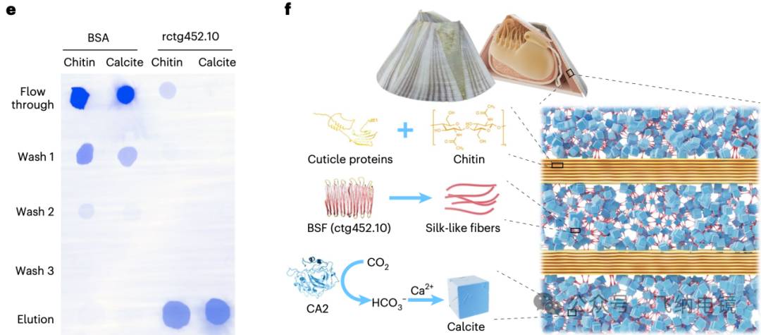 e. rctg452.10 蛋白与几丁质和方解石的结合实验结果,以牛血清白蛋白(BSA)作为对照,通过考马斯染色进行可视化。